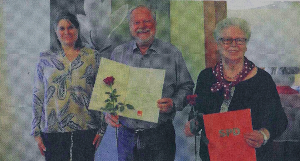 Zwei Mitglieder konnten für langjährige Mitgliedschaft geehrt werden: 10 Jahre ist Hans-Georg Zenker bereits Parteimitglied und beachtliche 50 Jahre die ehemalige Schriftführerin Elke Zondler. Sie hatte nicht nur eine beeindruckende Ausstellung "150 Jahre SPD" auf die Beine gestellt, sondern auch Ausflüge organisiert und zahlreiche Zeitungsberichte verfasst. Zum Schluss kündigte Ines Preuss eine Veranstaltung mit Leni Breymeier am 2. August des Jahres an.